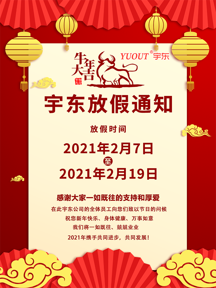 一年一度的農歷春節已經近在眼前,感謝大家對宇東公司的支持與厚愛,在此先預祝您新年快樂、身體健康、財源廣進!