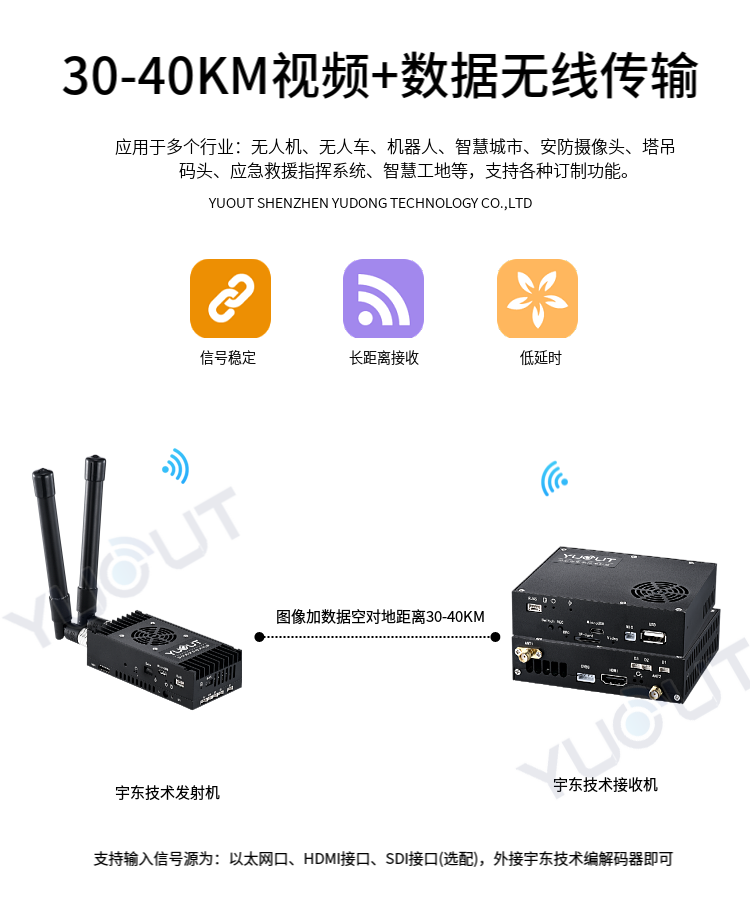 YD-TS0030-WK 是應(yīng)用于無人機(jī)行業(yè)的圖數(shù)控一體化超遠(yuǎn)距離無線傳輸設(shè)備(最遠(yuǎn)可達(dá) 30至40 公里),具有體積小、功耗低、通信距離遠(yuǎn)等特點(diǎn),支持高清視頻、飛控?cái)?shù)據(jù)、云臺控制數(shù)據(jù)、遙控器控制數(shù)據(jù)等同時(shí)傳輸。