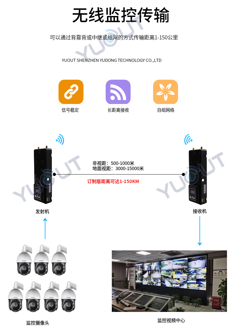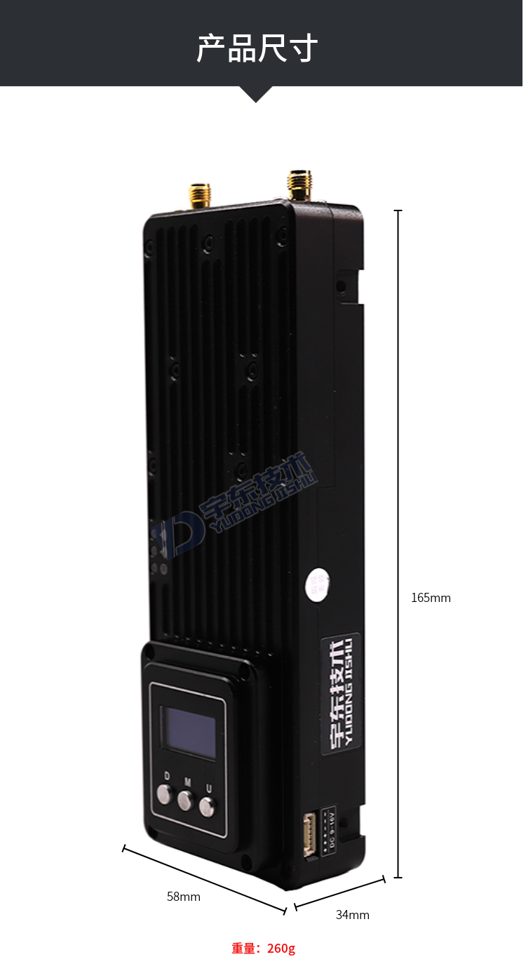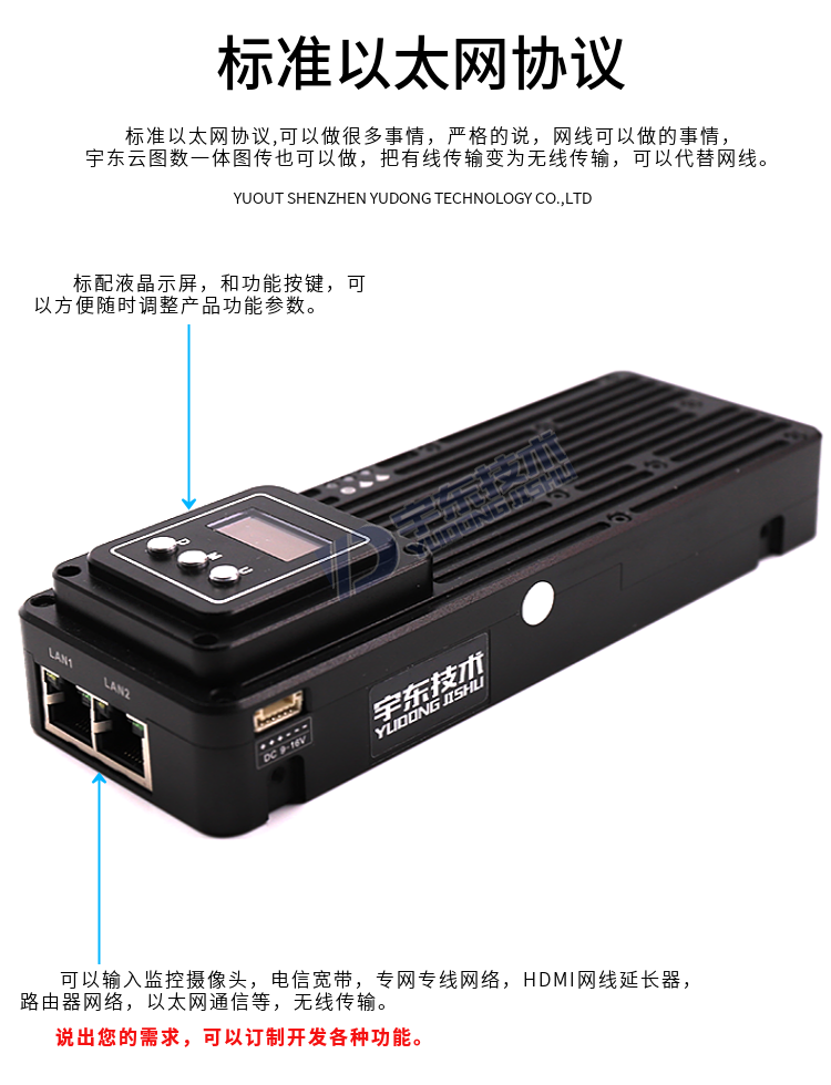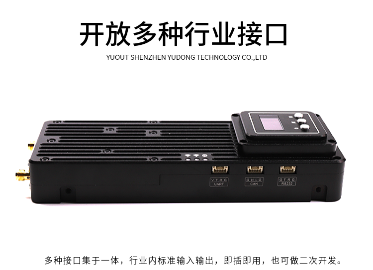 YDTD9000宇東視頻數據無線圖傳系統采用工業級無線高速率數據傳輸技術,非視距,非WIFI,集合正交頻分復用時分多址調制及MIMO多進多出容量技術,完全基于IP互聯網協議,實現全雙向透明通道寬帶傳輸。非視距:500-1000米;地面視距:3000-15000米;空對地:20000米。系統為純硬件連接,即插即用;創新性液晶一體化設計、豐富的CAN總線、RS-232、TTL電平接口,更好的用戶角度體驗。通道最大支持30Mbps吞吐量,可廣泛應用于工業自動化、工業機器人、無人機、視頻監控等通信工作。