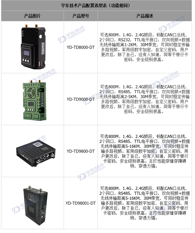 YD-TD9800-DT低時(shí)延無線圖傳系統(tǒng),采用工業(yè)級(jí)無線高速跳頻傳輸技術(shù),非視距,非WIFI,集合正交頻分復(fù)用時(shí)分多址調(diào)制及MIMO多進(jìn)多出容量技術(shù),完全基于IP互聯(lián)網(wǎng)協(xié)議,將信道資源在時(shí)間上通過時(shí)隙、頻率上通過子載波來靈活分配給多個(gè)用戶,在單一頻率點(diǎn)最大限度的提供多用戶接入,完全實(shí)現(xiàn)雙向透明通道寬帶傳輸。通道最大支持30Mbps吞吐量,視距可傳輸:10-18公里。系統(tǒng)為純硬件連接,即插即用;創(chuàng)新性液晶一體化設(shè)計(jì)、豐富的CAN總線、RS-232、TTL電平接口,更好的用戶角度體驗(yàn)。且系統(tǒng)具有很強(qiáng)的抗多徑干擾能力,克服模擬技術(shù)和常規(guī)調(diào)制技術(shù)下多徑反射及遮擋所帶來的困擾,實(shí)現(xiàn)在復(fù)雜的環(huán)境下多點(diǎn)傳輸寬帶數(shù)據(jù)、視頻、音頻。可廣泛應(yīng)用于工業(yè)自動(dòng)化、工業(yè)機(jī)器人、無人機(jī)等通信工作。