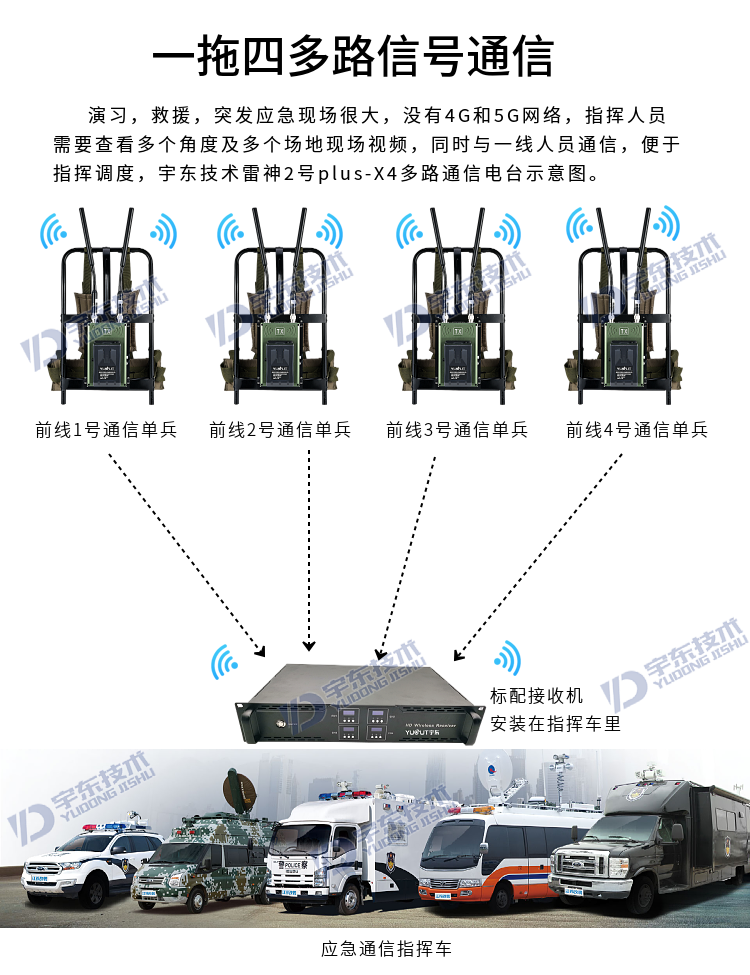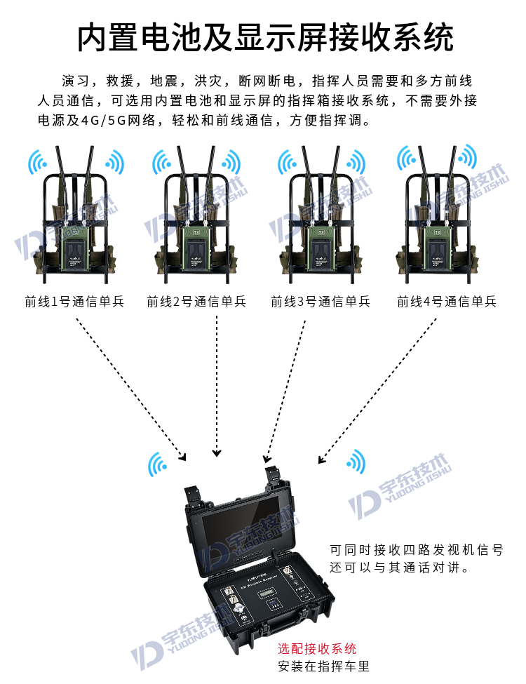 宇東技術(shù)雷神2號(hào)plus-X4一拖四背負(fù)式高清無線圖傳電臺(tái),是應(yīng)對(duì)突發(fā)事故,斷網(wǎng)斷電,如地震、洪災(zāi)、反恐、應(yīng)急救援、部隊(duì)演習(xí)等使用通信,本設(shè)備由4路背負(fù)式單兵發(fā)射機(jī)電臺(tái)和1臺(tái)四路接收于一體的接收電臺(tái)地面指揮箱組成,指揮箱自帶四路接收模組和顯示器及功能按鍵,可同時(shí)接收四路發(fā)射機(jī)的視頻和對(duì)講信號(hào)數(shù)據(jù),指揮箱自帶揚(yáng)聲器,可接收DV無線發(fā)送現(xiàn)場(chǎng)的聲音數(shù)據(jù)。支持?jǐn)U展HDMI外接顯示大屏及插USB錄像保存功能,真正義意上做到及時(shí)取證,錄像保存,移動(dòng)通信,統(tǒng)計(jì)指揮調(diào)度等。