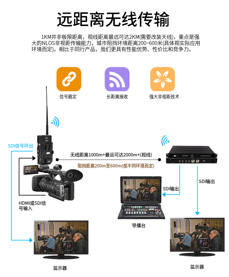 雷神2號無線圖傳雙V扣扳式廣電直播無線視頻傳輸系統(tǒng),非視距(環(huán)境復(fù)雜、可穿墻、人多、車多、樹多及障礙物多的地方),高清無線圖像實(shí)時(shí)傳輸系統(tǒng)主應(yīng)用于廣播電視臺、影視拍攝、教育直播、大型演唱會、電影電視制作、體育轉(zhuǎn)播、社會新聞、空中實(shí)況、演播室、公安、消防、海事、 交警、人防應(yīng)急、城管執(zhí)法、三防應(yīng)急等方面。可訂制外觀及功能,地面視距:1~2公里;非視距:200~600米。具體視實(shí)際應(yīng)用環(huán)境而定,可選擇HDMI輸入或SDI輸入, SDI輸出等。
